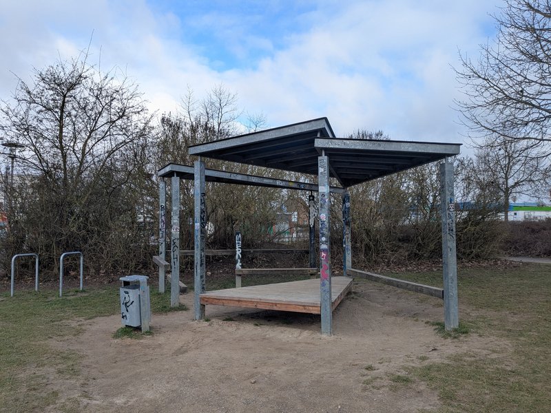 Ausstattung: drehbare Seilpyramide, Sandspielturm mit Rutsche für kleinere Kinder bis 6 Jahre, Spielgerät mit Rutsche für Kinder von 6 bis etwa 12 Jahre, Wipptier, Jugendhütte, Jugendtreff, 2 Kleinfeldtore, 1 Basketballkorb