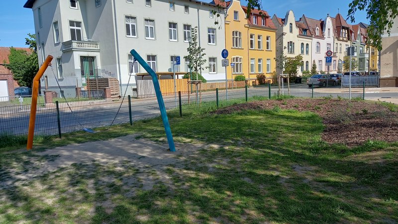 Ausstattung: Bereich für ganz kleine Menschen mit Sandpiel-Rundhütte mit Rutsche und kleiner Schaukel und Bereich für größere kleine Menschen mit Kletterkombination mit Rutsche, großer Drehscheibe, Stehwippe und Doppelschaukel